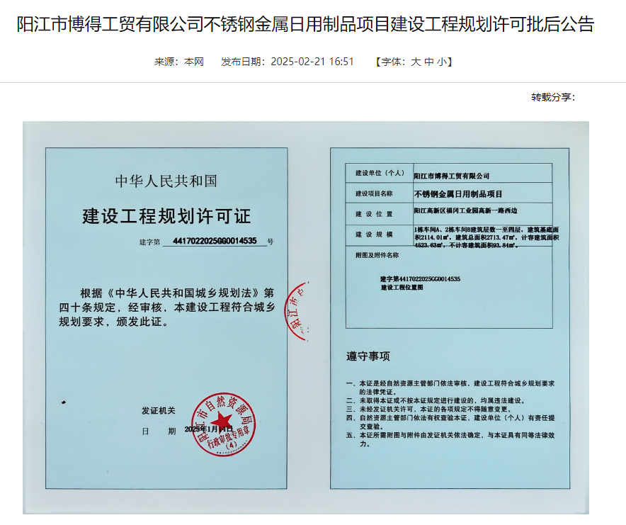 2025年2月21日,陽江市博得工貿有限公司不銹鋼金屬日用制品項目建設工程規劃獲許可批后公告。